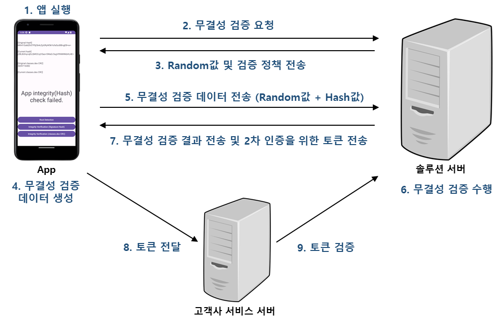 솔루션의 경우 Random값을 통한 해시값 변조 방지 및 2차 인증을 위한 토큰 전송 등으로 무결성 검증의 프로세스 우회를 방지하고 있습니다.