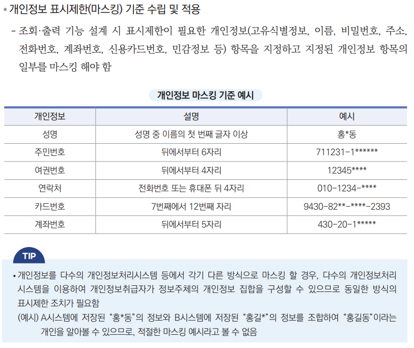 마스킹 처리 기준을 클라이언트(자바스크립트)로 처리하는 경우, 자바스크립트 조작, 개발자 도구, Web Proxy 등을 통해 중요정보를 확인할 수 있으므로 마스킹은 서버에서 적용 후 전송해야 합니다.