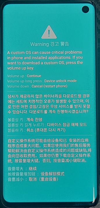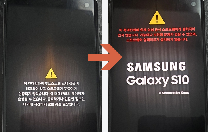 3. "전원" + "빅스비" + "볼륨상 키" 버튼 누르고 있다가 아래 첫 번째 화면에서 두 번째 화면으로 전환된 후 버튼을 놓으면 루트 모드로 부팅