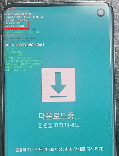 7. "볼륨상 키" 버튼을 눌러 다운로드 모드 실행 (FRP LOCK: OFF, OEM LOCK: OFF 확인)