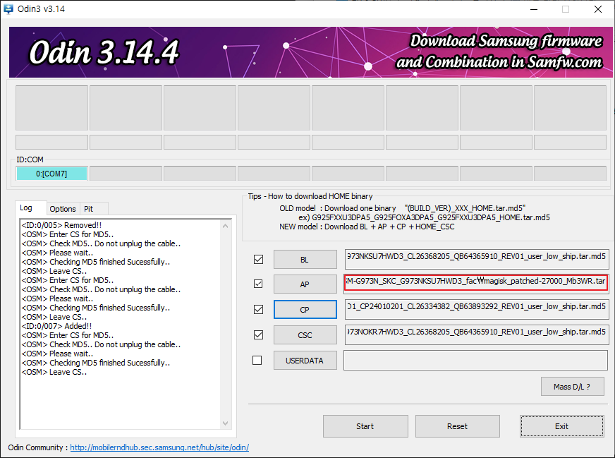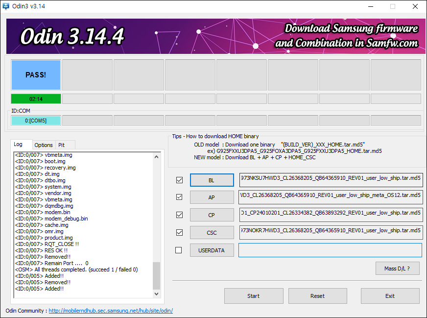 오딘에서 BL, AP, CP, CSC를 클릭하여 다운로드한 펌웨어 파일 선택 후 Start 눌러 설치를 진행합니다.