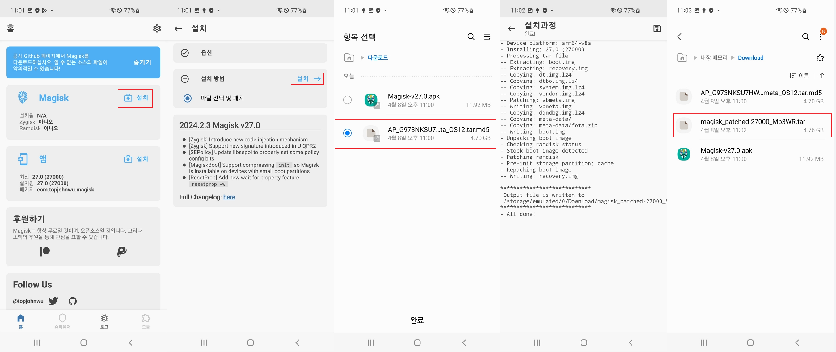 3. Magisk 실행 후 설치 > "파일 선택 및 패치" 선택 후 설치 > AP 파일 선택 > 패치 완료 > magisk 파일 생성(.tar)