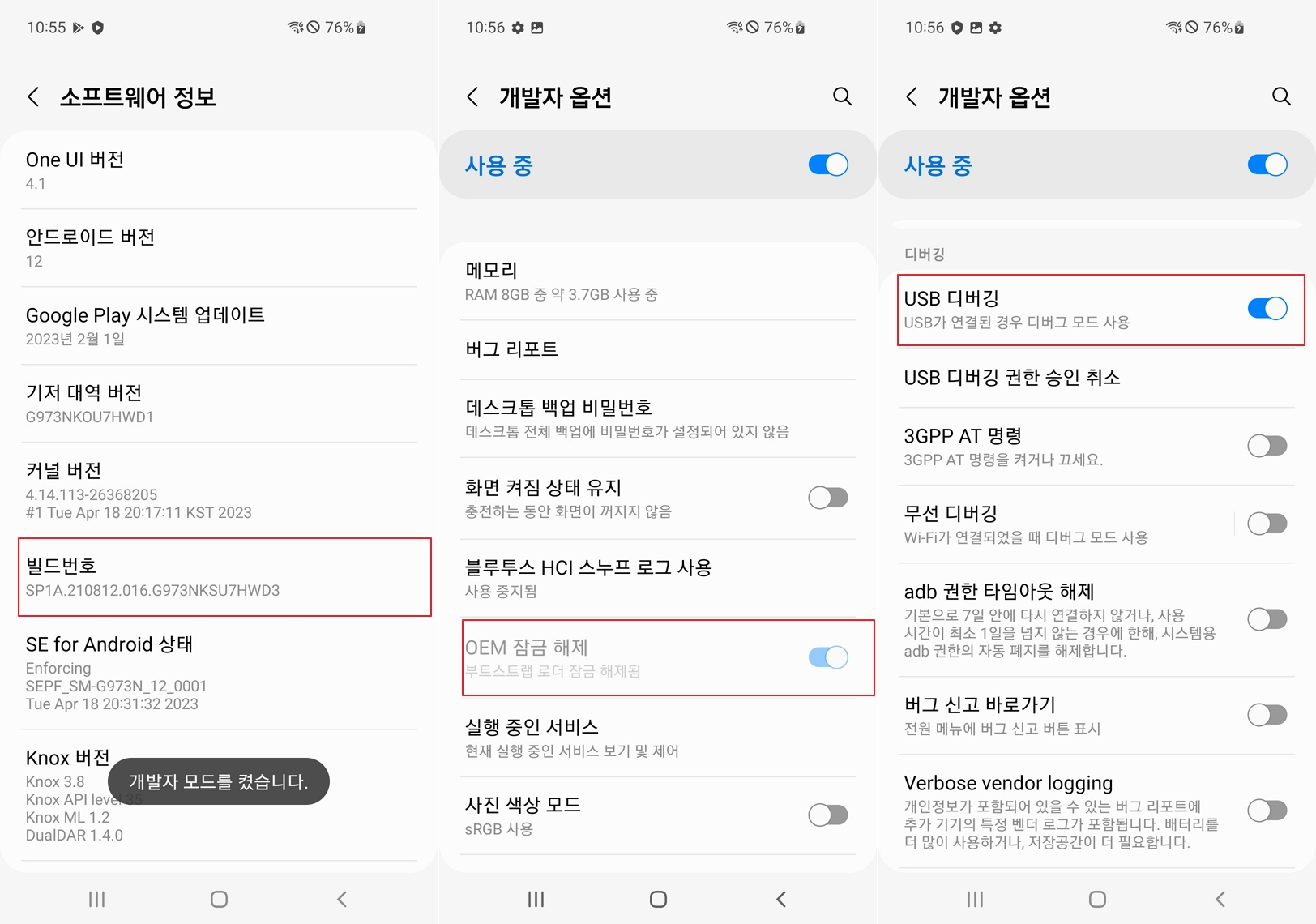 1. 설정 > 휴대전화 정보 > 소프트웨어 정보 > 빌드번호 7번 터치 > 개발자 모드 활성화