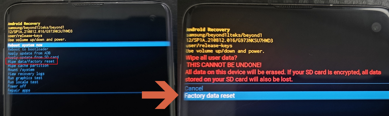 11. 볼륨 버튼을 이용하여 "Wipe data/factory reset" 진입 후 "Factory data reset"을 전원버튼으로 선택