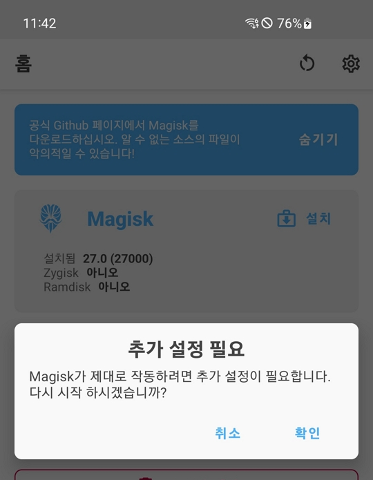 14. Magisk 실행 시 위의 메시지가 출력되면 확인을 누르면 자동으로 재부팅되고 루팅 완료